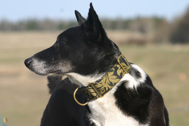 Rook shows off his "Pirate buckle collar" with a howl when he hears the coyotes during this shot. This collar is getting a bit tight for him as he grows. I will be taking him to town soon to fit him for a new one. The buckle collar must be worn for trial events so I will need to get a new one soon. I fluctuate between using a buckle and martingale when training. |